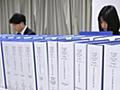 選挙長(左)の前にある白い筒の中に2本の棒を入れてくじ引きが行われた茨城県神栖市長選=茨城県神栖市のかみす防災アリーナで2025年11月9日午後10時23分、斉藤瞳撮影 現職と新人の一騎打ちで得票同数となり、くじ引きで当選者を決定――。11月9日に投開票された...
