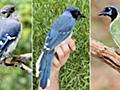 サンアントニオ郊外で確認された珍しい交雑種(中央)は、オスのアオカケス(左)とメスのインカサンジャクの交配の結果だったことがわかった/Education Images/Universal Images Group/Getty Images; Brian Sto...